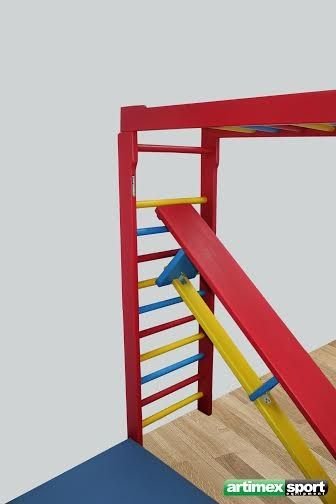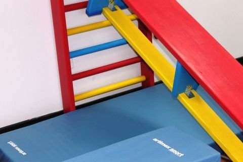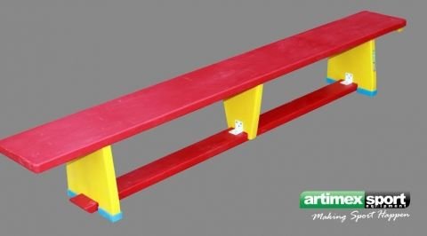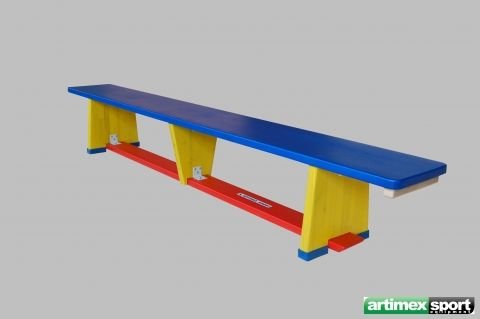 Banca gimnastica vopsita in 3 culori, cu lungimea de 2 m realizata din elemente lamelare din molid, cu grosimea de 33 mm, finisata la colturi pentru a evita orice pericol de accidentari.