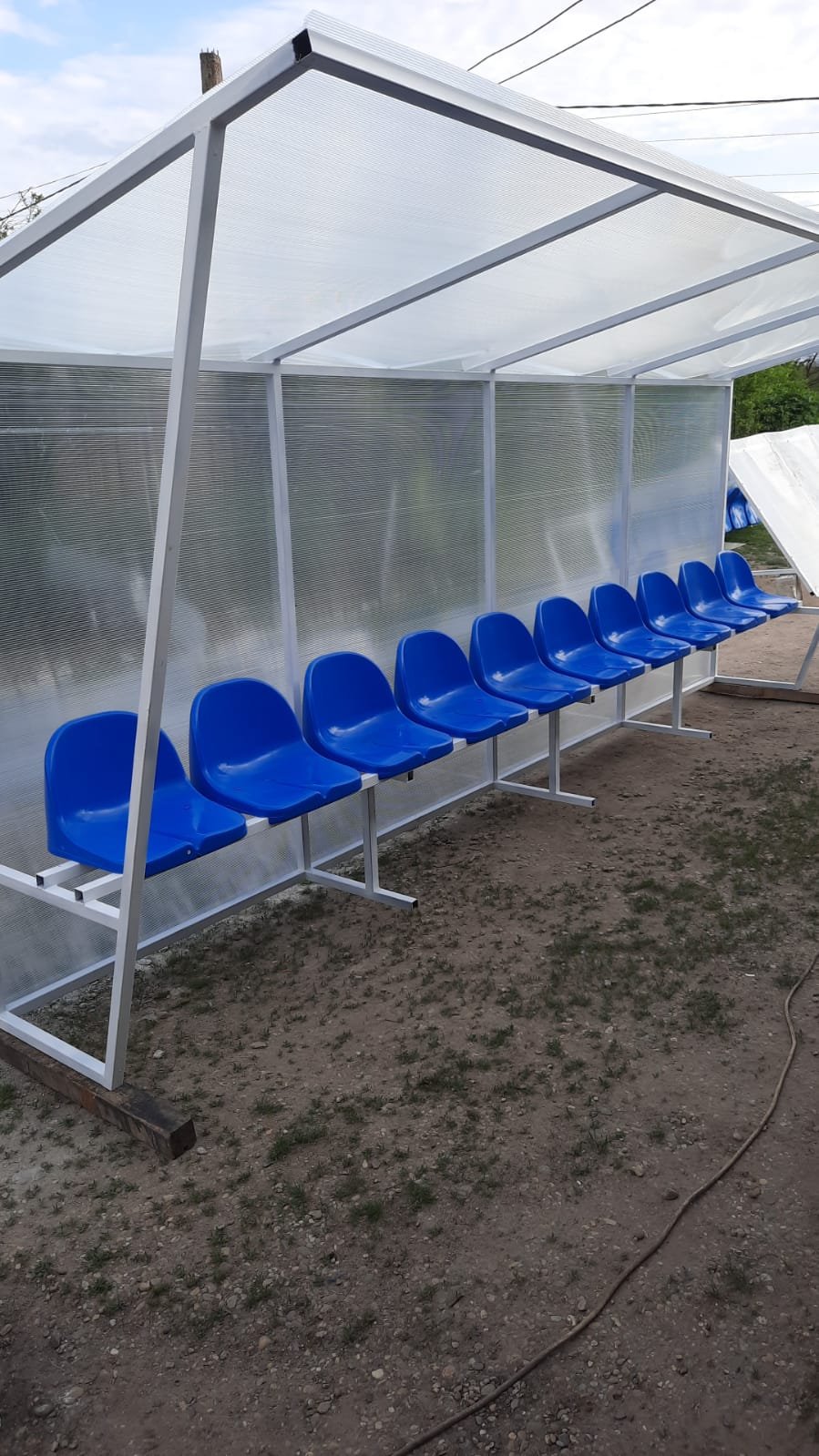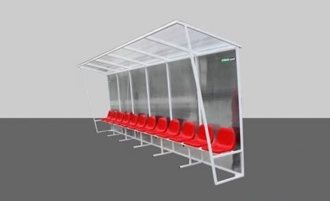 Banca de rezerva pentru jucatori, cu 15 locuri, produsa de Artimex Sport este realizata din structura metalica de 30 x 30 x2 mm vopsita in camp electrostatic. Este acoperita cu policarbonat transparent rezistent la intemperii si la raze ultraviolete.