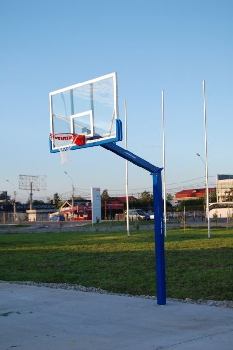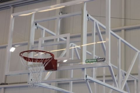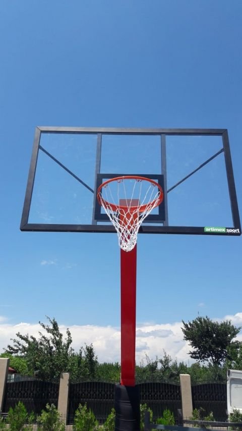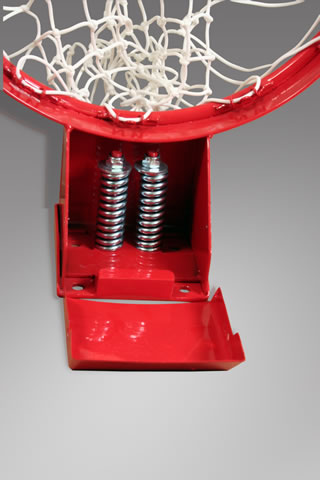 Inel de baschet rabatabil produs de Artimex Sport, vopsit in camp electrostatic, culoare rosu. Miscarea de revenire a inelului este controlata de 2 arcuri din otel, care reactioneaza la o greutate de 45 kg.