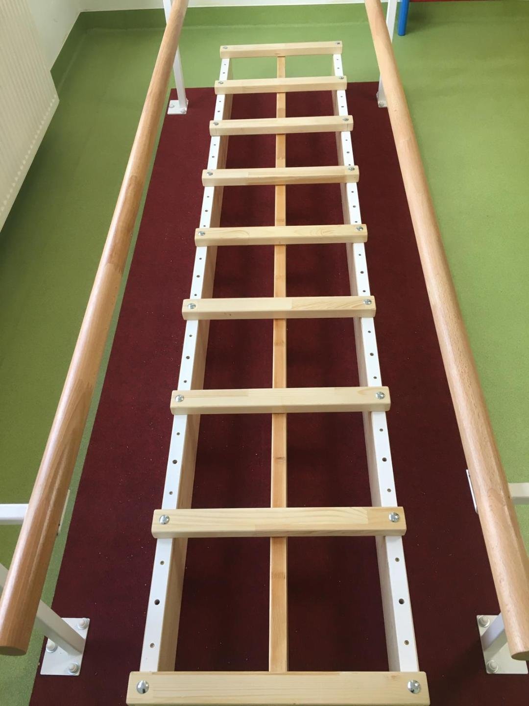Inaltimea barelor din fag cu diametrul de 40 mm este ajustabila de la 50 la 100 cm. De asemenea mana curenta se poate apropia sau indeparta de traverse, pentru a da posibilitatea copiilor de varste diferite sa lucreze la acest aparat.