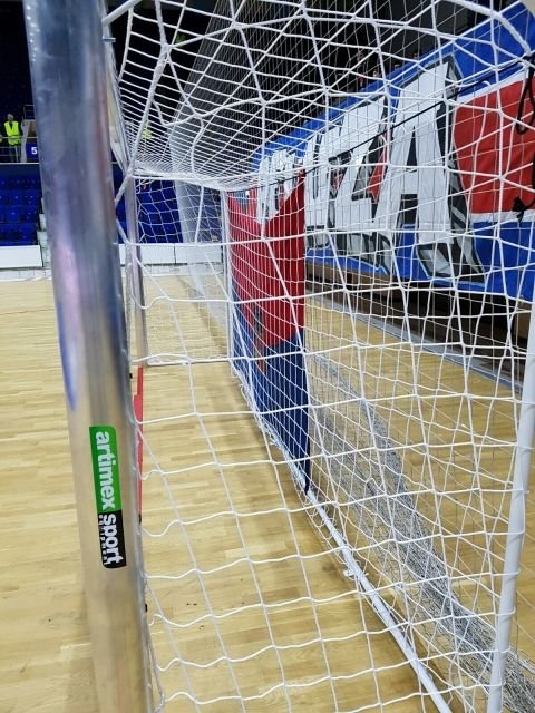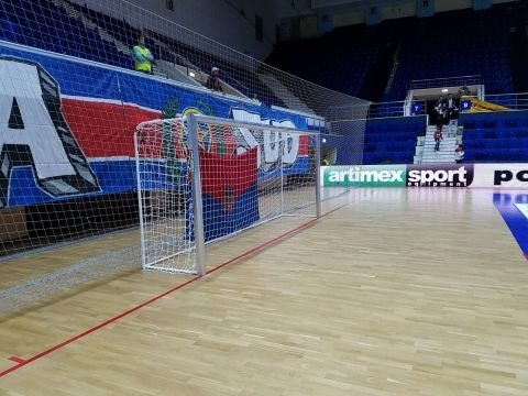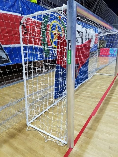 Poarta fotbal pentru sala sport, produsa de Artimex Sport si realizata din profil oval de 120 x 100 mm aluminiu, cu spate din otel vopsit in camp electrostatic.