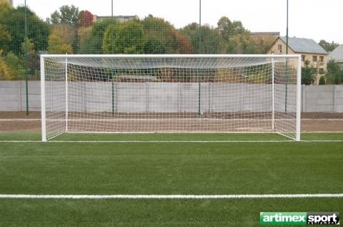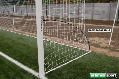 Porti fotbal fixe, cu spate rabatabil pentru terenuri cu dimensiuni oficiale, produse de Artimex Sport, realizate din bare de dur aluminiu,profil oval 120 x 100 mm, culoare alba.