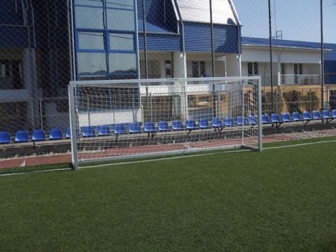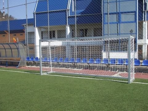 Porti fotbal produse de Artimex Sport, dimensiuni 5 x 2 m, din dur aluminiu eloxat, profil patrat 80 x 80 mm, spatele portilor si barele de sustinere a plasei sunt din teava metal profil rotund, vopsita in camp electrostatic.