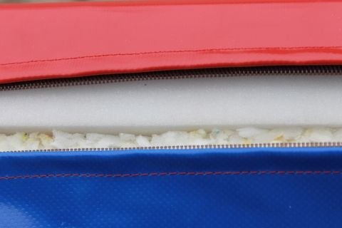Este acoperita cu material textil cu insertie pvc (600 g/mp)(import Germania), special pentru saltele, culoare albastra, si pvc rosu pe partea opusa.