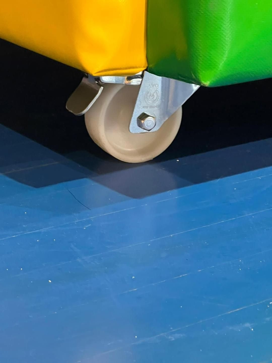 Prevazut cu 4 roti pentru deplasare usoara, din care doua roti sunt prevazute cu frane, pentru a evita deplasarea lui in timpul jocului.