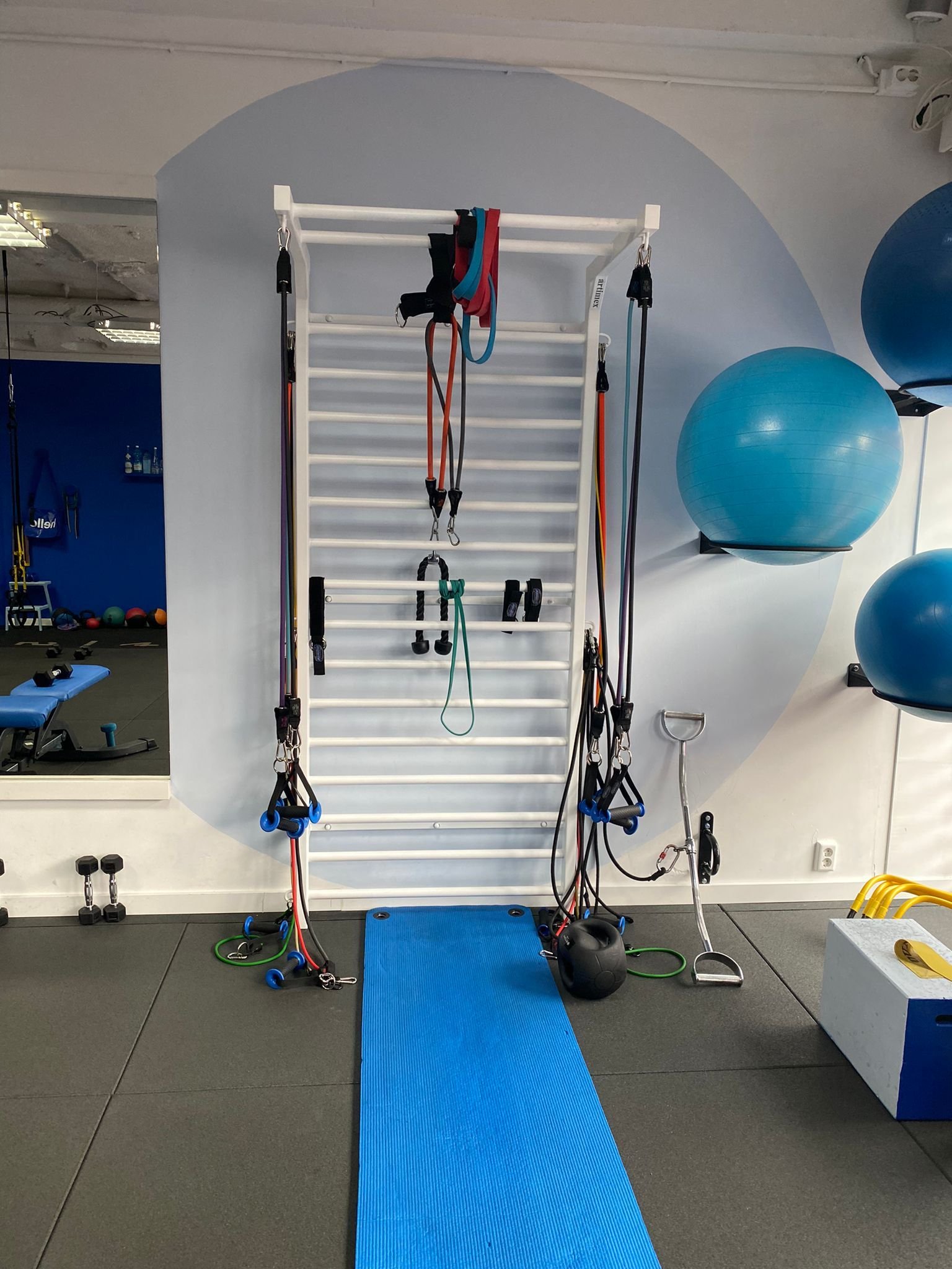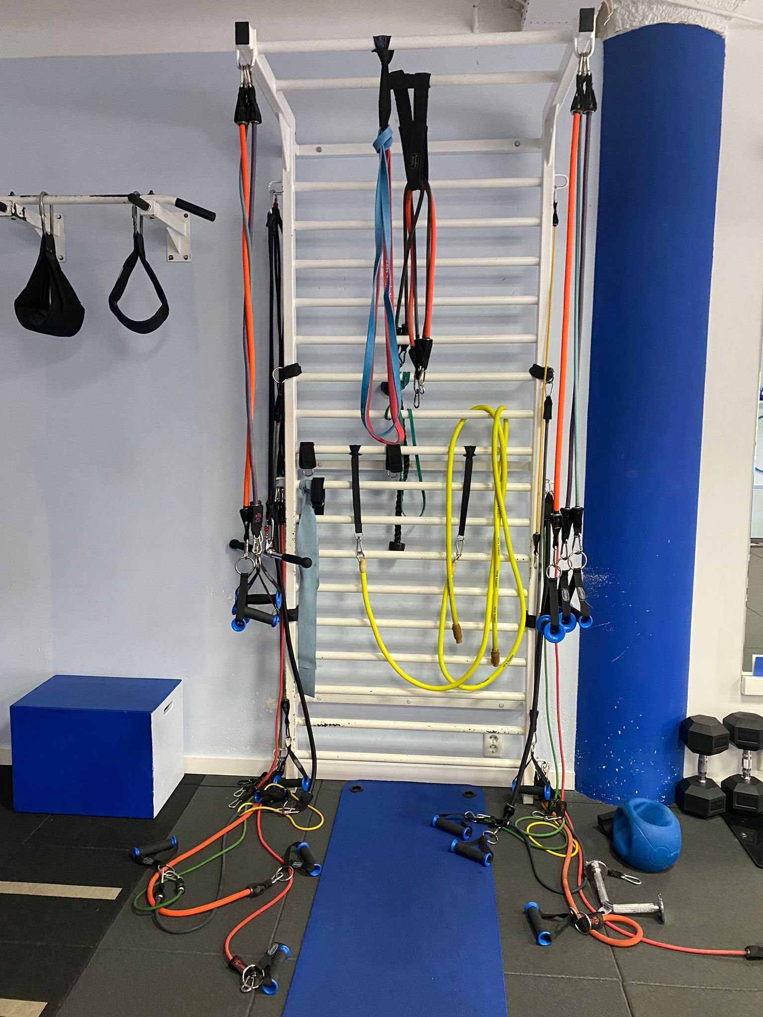 Spalierul este prevazut cu 3 carlige metalice pe fiecare laterala pentru a putea fi agatate diverse corzi elastice, Trx, etc.