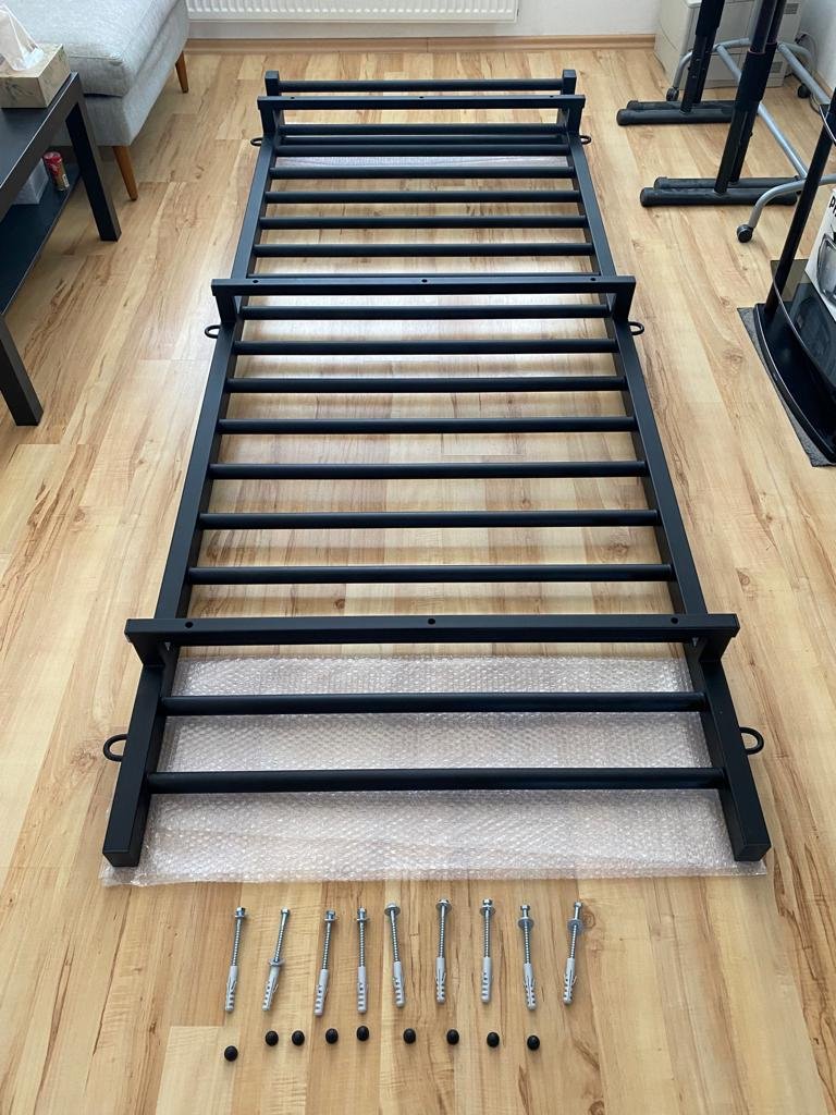 Lateralele spalierului sunt din metal (60 x 40 mm), vopsite in camp electrostatic in culoarea negru sau alb, iar cele 15 bare ovale din fag au diametrul de 40 x 30 mm (vezi video) (la cerere spalierul se livreaza cu bare rotunde cu diametrul de 36 mm, fara costuri suplimentare).
