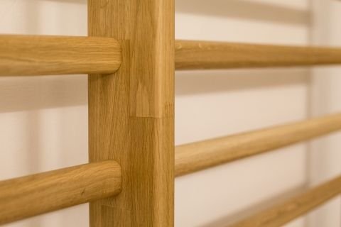 Lateralele spalierului sunt realizate din elemente lamelare din stejar iar cele 2×17 bare ovale ale spalierului sunt realizate din cherestea de stejar cu diametrul de 40 x 30 mm.