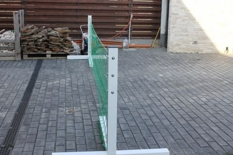 Stalpi tenis cu piciorul, mobili din dur-aluminiu, fabricati de Artimex Sport, realizati din profil patrat de 80 x 80 mm, vopsiti in camp electrostatic, culoare alba, inaltime 107 cm.